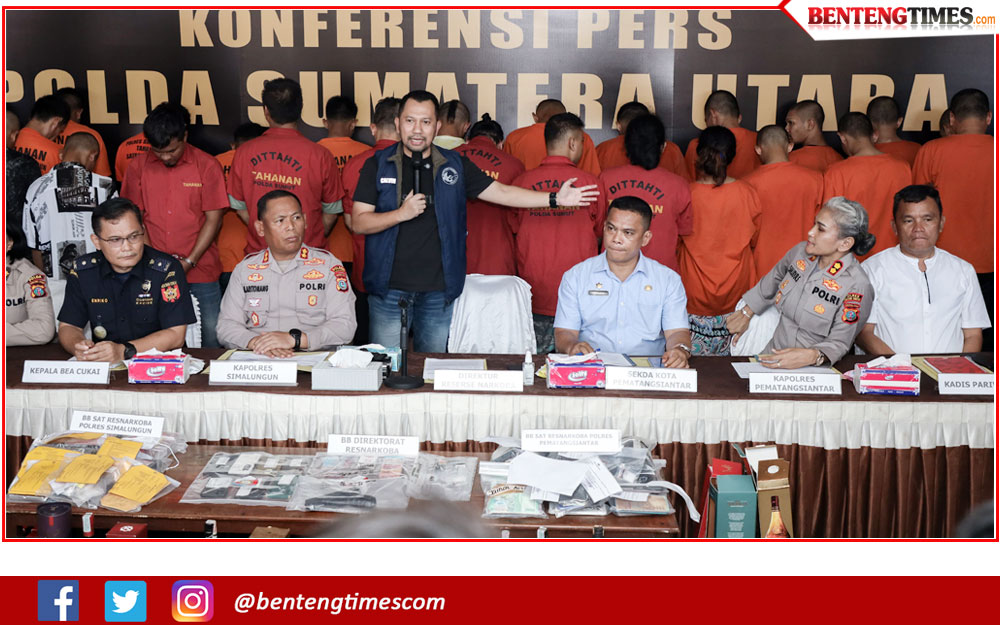 Dirresnarkoba Polda Sumut, Kombes Pol Dr Jean Calvijn Simanjuntak mengungkapkan peredaran narkoba dan minuman keras (Miras) ilegal di Kota Pematangsiantar, saat konferensi pers di Mapolres Pematangsiantar, Jumat (02/05/2024) siang.