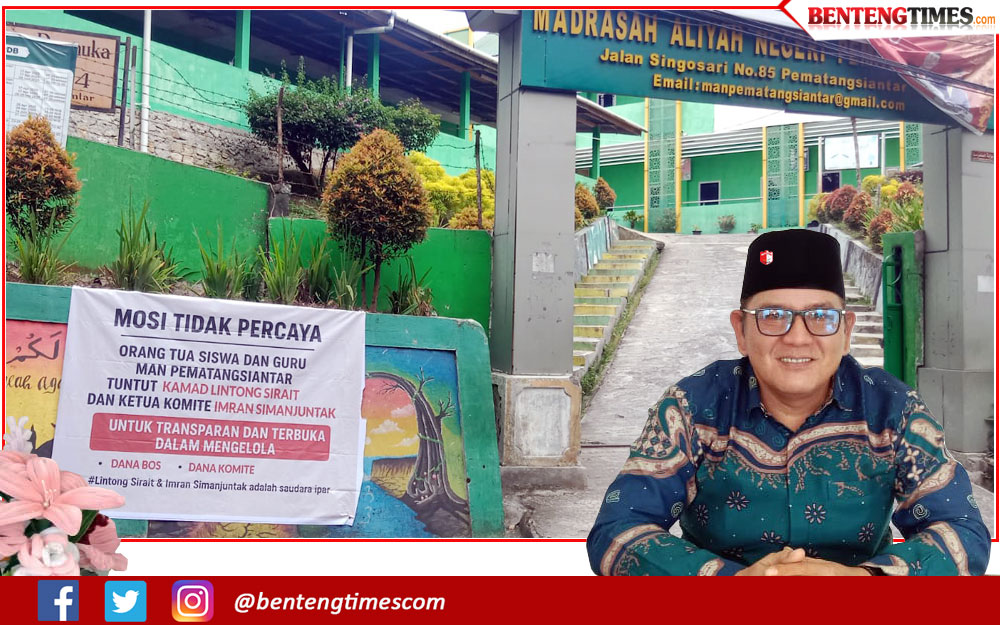 SIANTAR, BENTENGSIANTAR.com– Kinerja Komite Sekolah Madrasah Aliyah Negeri (MAN) Kota Pematangsiantar, terutama dalam hal pengelolaan Dana Komite sekolah menjadi sorotan publik. Fenomena ini mencuat pasca kemunculan spanduk berisi mosi tidak percaya dari orangtua terhadap kepala madrasah, Lintong Sirait dan ketua komite, Imran Simanjuntak, yang terpampang di depan gerbang pintu masuk madrasah.