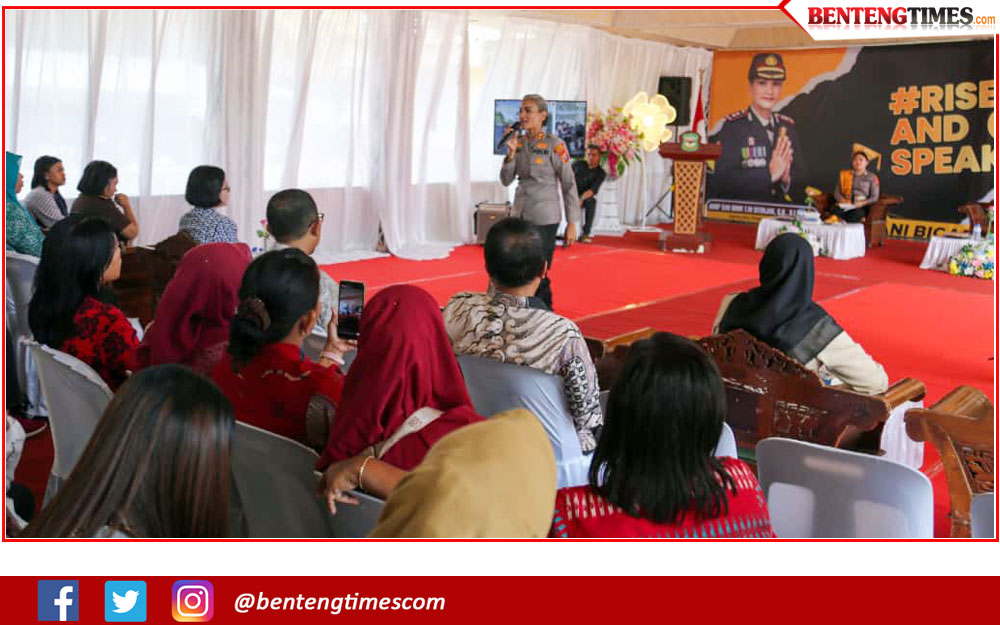 Kapolres AKBP Sah Udur mengajak peserta sosialisasi untuk tidak menjadi pelaku bully (perundungan), kekerasan, dan pelecehan, saat menjadi narasumber pada saat menghadiri Sosialisasi #Rise and Speak, di Balai Bolon Lapangan Adam Malik, Sabtu (11/10/2025) pagi.