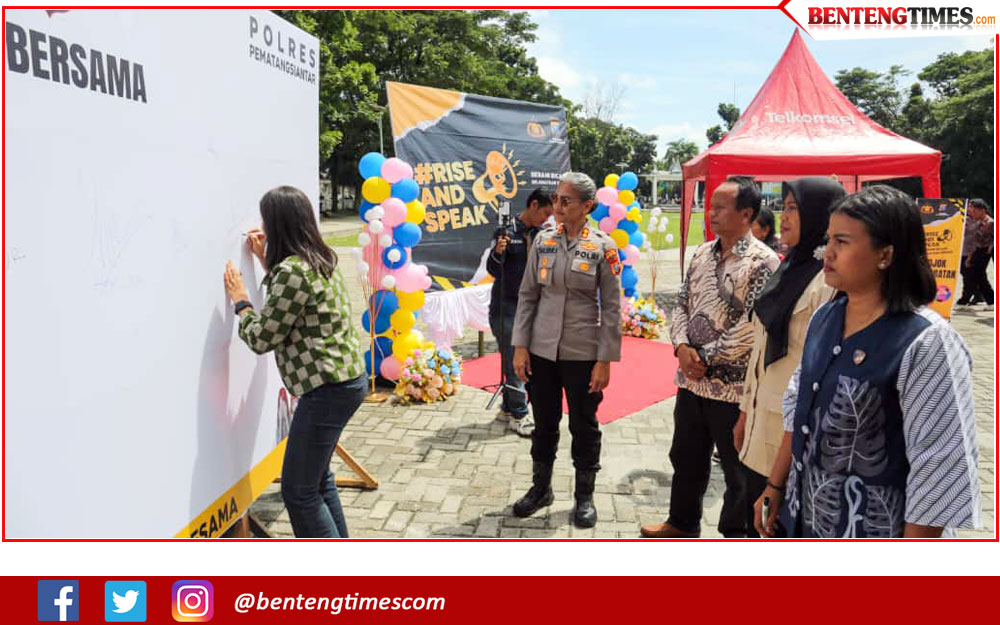 SIANTAR, BENTENGSIANTAR.com– Wakil Wali Kota Pematangsiantar, Herlina menghadiri Sosialisasi #Rise and Speak bersama Polres Pematangsiantar, di Balai Bolon Lapangan Adam Malik, Sabtu (11/10/2025) pagi. Dalam kesempatan itu, Herlina turut mengampanyekan #Rise and Speak, Berani Bicara Selamatkan Sesama.